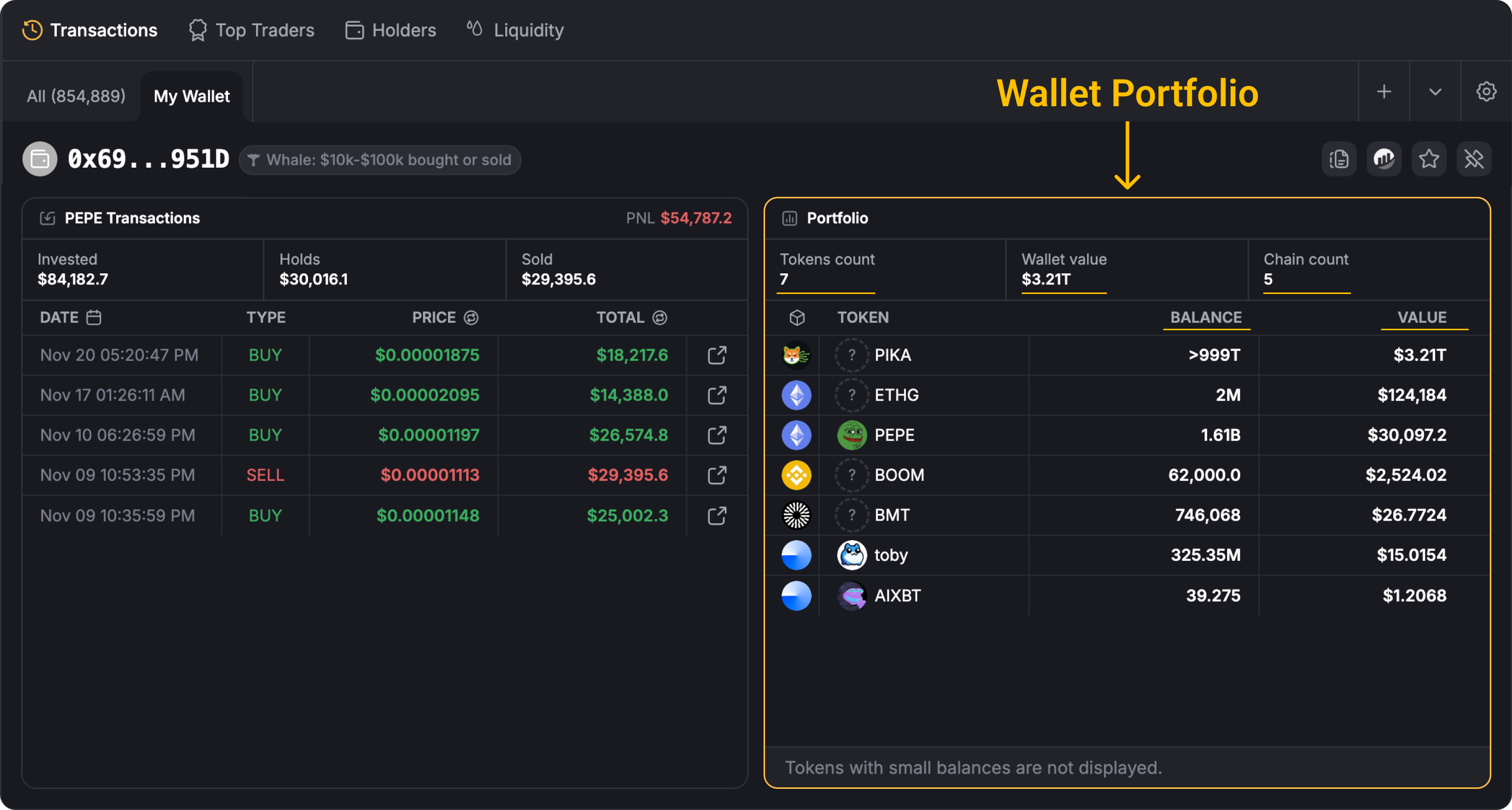 The first section on the left shows the holdings on the selected token page. For example, if you open the $PEPE token page, it will display details such as the amount **invested**, current **holdings**, amount **sold**, and **PNL** for the PEPE holdings in your wallet, along with information about the token’s **buy and sell transactions**.