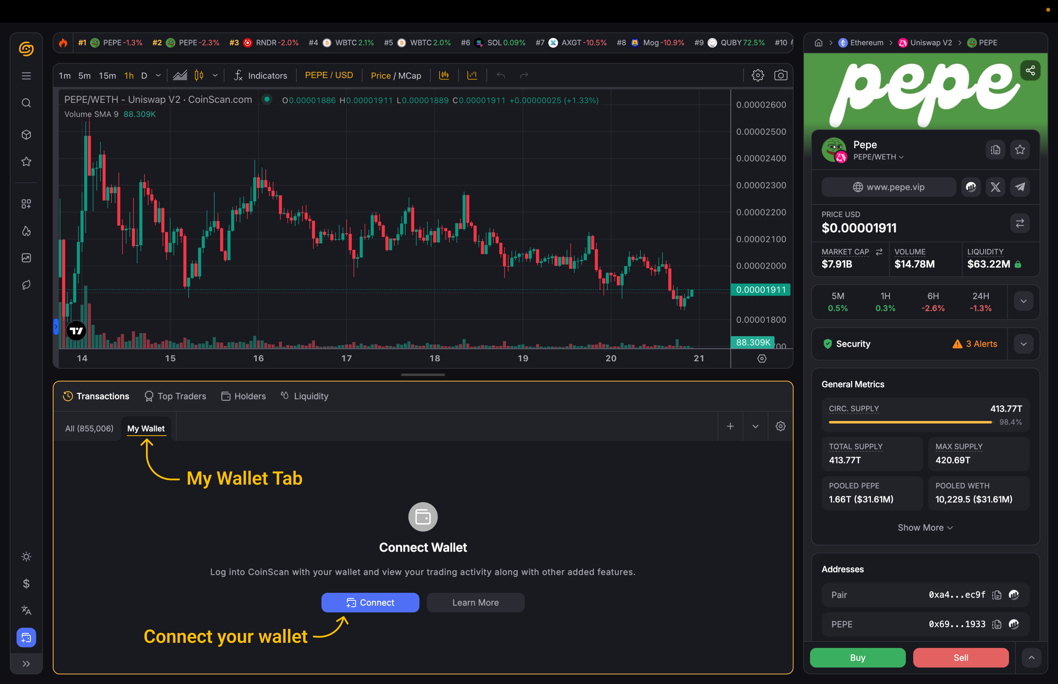 Once your wallet is connected, the ‘My Wallet’ tab on every token page will display a comprehensive summary of your holdings.